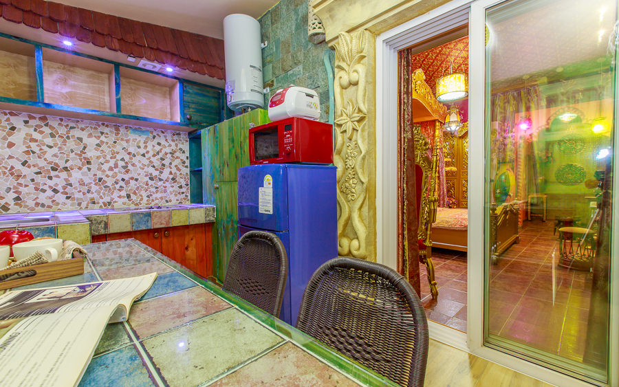 침대, 냉장고, 싱크대, 전기인덕션, 전자레인지, 전기밥솥, 냉온수기, 식기세트, 식탁, 벽걸이TV, 에어컨, 드라이기, 세면용품, 수건